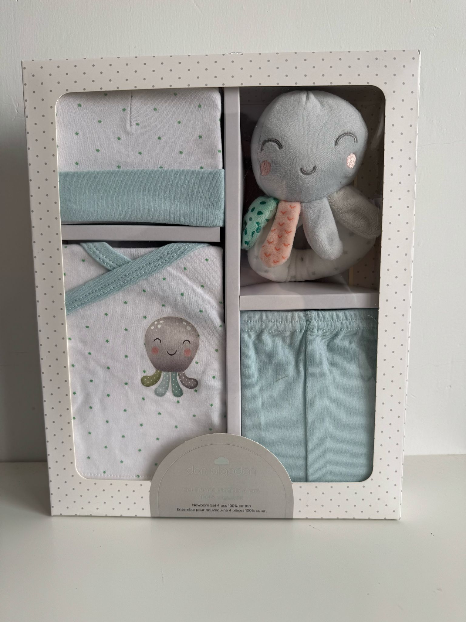 Pack de conjunto primera puesta de la marca don algodón que incluye camiseta y polaina con gorro a juego y un divertido sonajero de pulpo