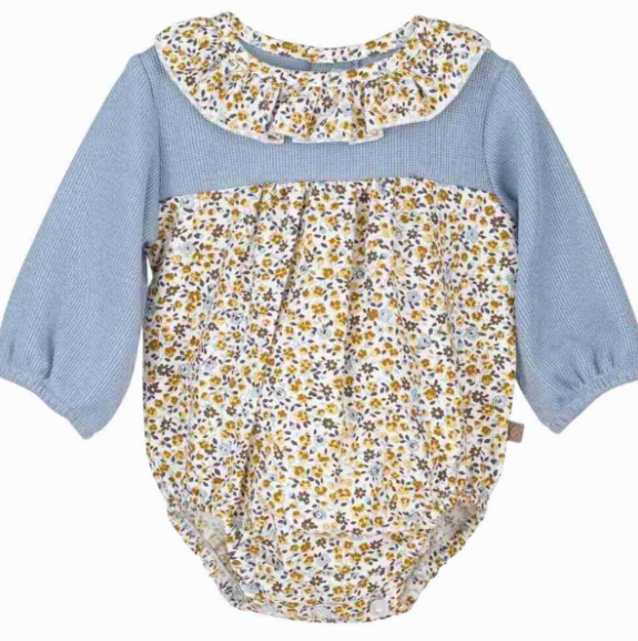 Este pelele de cuerpo en punto azul de la marca Calamaro combina comodidad y estilo para los más pequeños. Su diseño con vates y flores aporta un toque delicado y único, perfecto para vestir a tu bebé con suavidad y elegancia. Ideal para mantener su piel protegida y fresca durante todo el día.