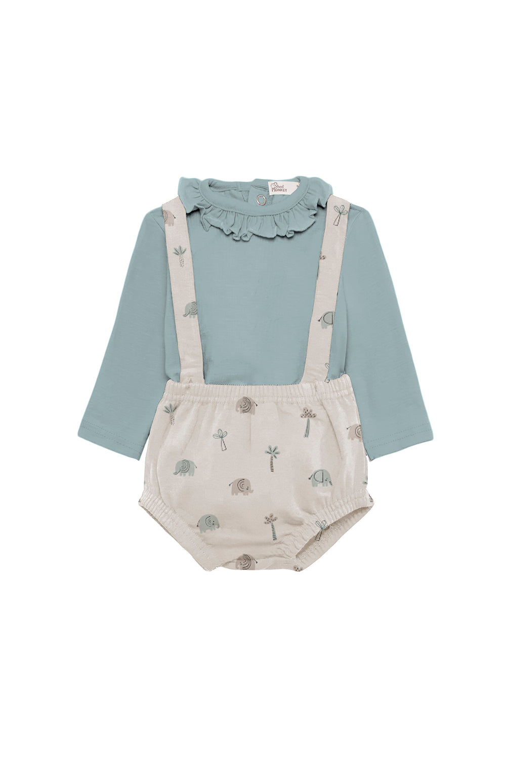 Descubre el conjunto Pelele Street Monkey elefantes, que combina una camiseta azul verdosa con un pelele beige decorado con encantadoras palmeras y elefantes. Ideal para que los más pequeños disfruten con comodidad y estilo, este conjunto ofrece tejidos suaves y frescos que cuidan su piel. Perfecto para cualquier ocasión, aporta un toque original y divertido al vestuario infantil. ¡Haz que su look destaque con esta combinación irresistible!